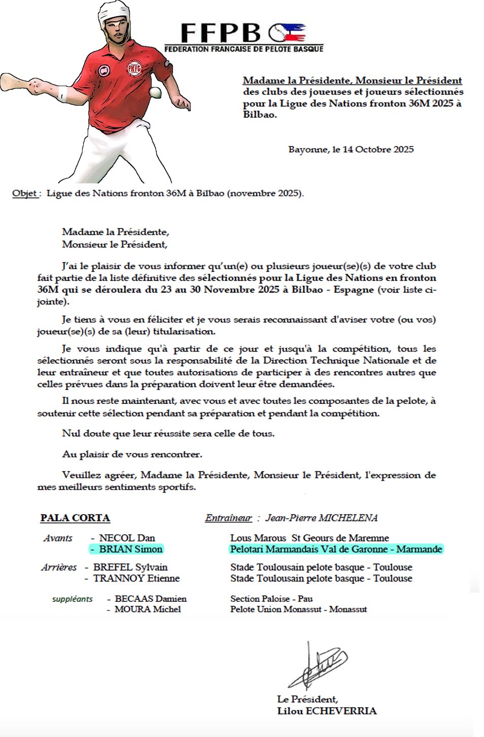 Nous sommes heureux et fiers de vous annoncer la selection en équipe de France de pelote basque de Simon Brian. Il a été retenu pour participer à la ligue des nations ( championnat du monde ) du 23 au 29 novembre 2025 à Bilbao.